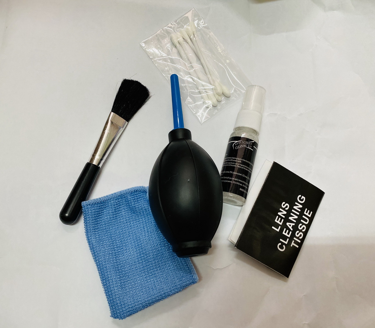 • Bộ vệ sinh bao gồm: Quả bóng cao su bóp thổi bụi trong các khe góc, cây chổi lông mềm vệ sinh bo mạch, nước lau màn hình, Cây bông gòn, khăn cứng, khăn mềm lau LCD